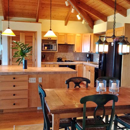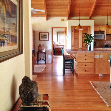 The central part of the house is spacious and open with kitchen, dining area, living room and access to the covered lanai which has outdoor seating and dining.